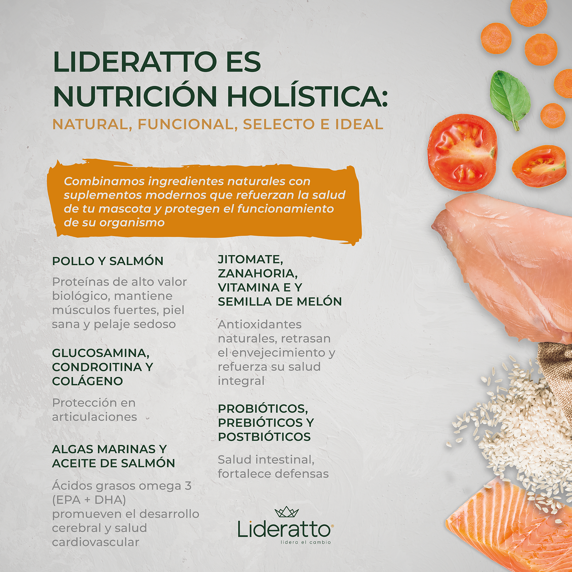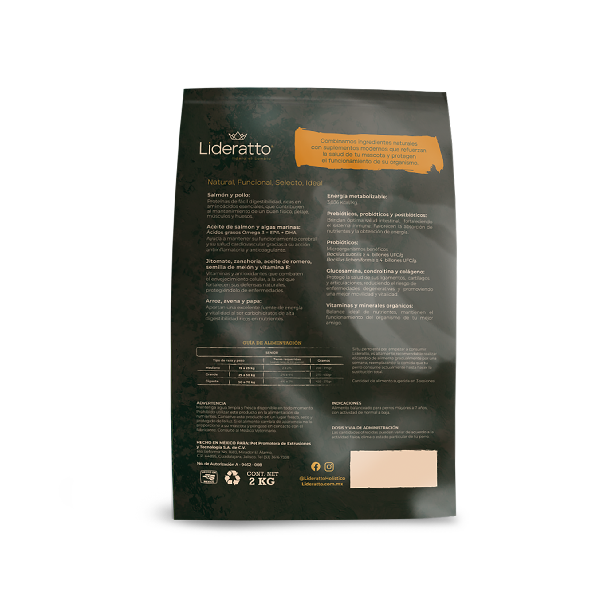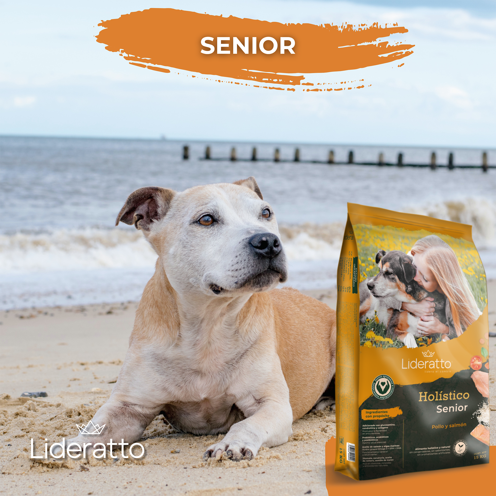 Lideratto Senior receta Pollo y Salmón es un alimento natural, holístico y funcional, formulado para satisfacer los requerimientos nutricionales de los perros senior.