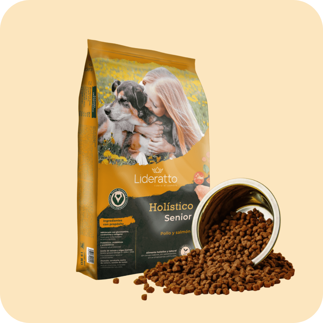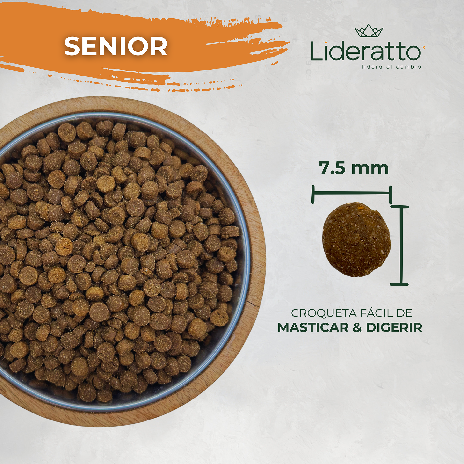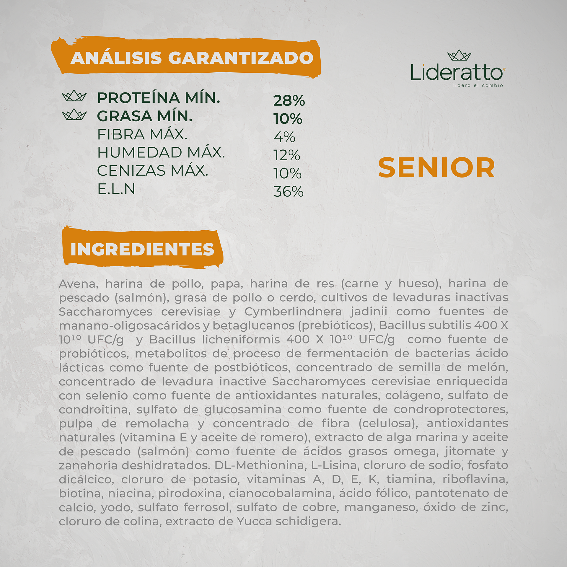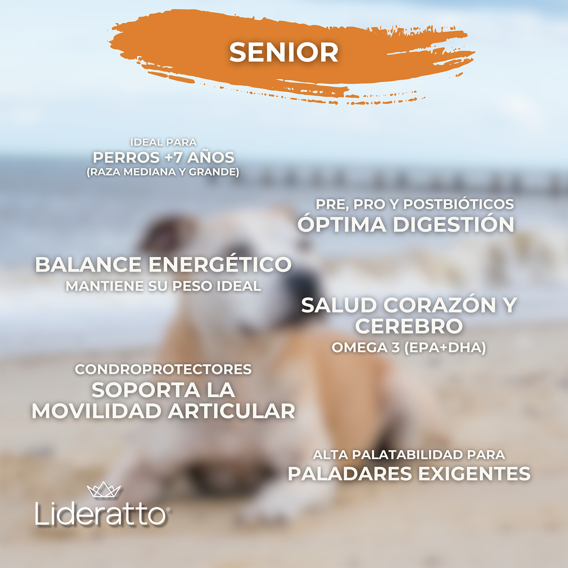 Lideratto Senior receta Pollo y Salmón es un alimento natural, holístico y funcional, formulado para satisfacer los requerimientos nutricionales de los perros senior.